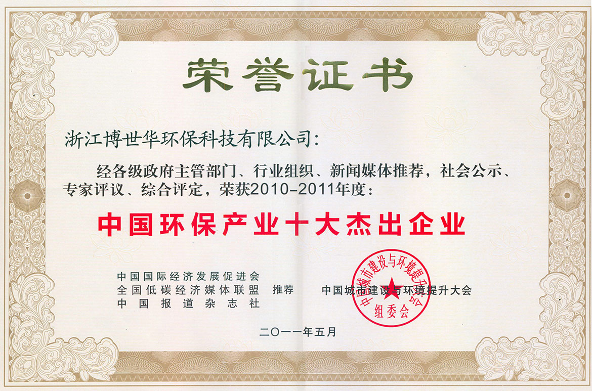 經(jīng)各級政府主管部門、行業(yè)組織、新聞媒體推薦,社會(huì)公示、專家評議、綜合評定,公司榮獲2010-2011年度“中國環(huán)保產(chǎn)業(yè)十大杰出企業(yè)”