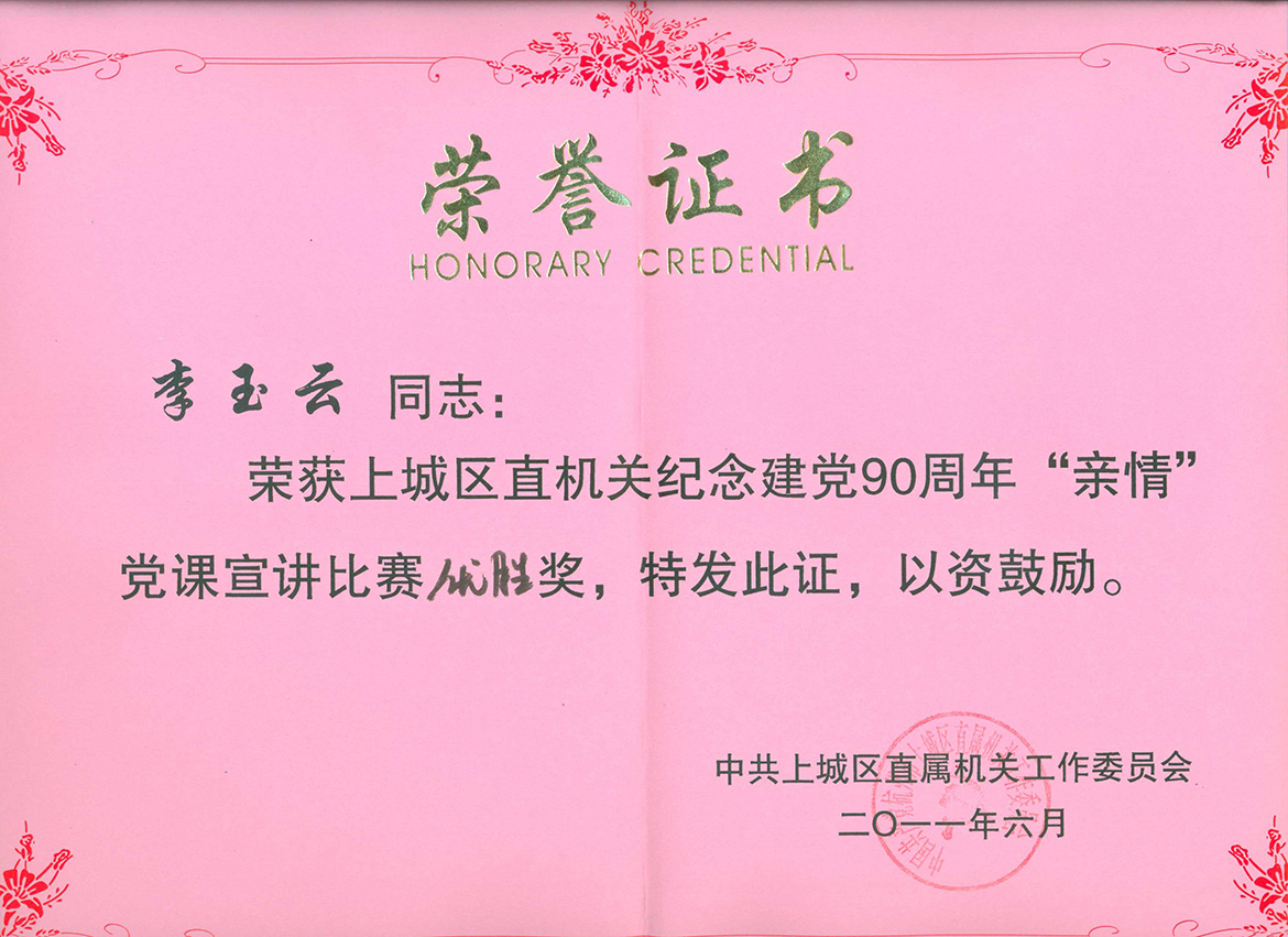 一、參加上城區直機關紀念建黨90周年“親情”黨課演講比賽,李玉云同志喜獲三等獎