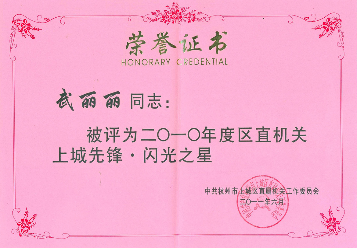 祝賀我公司員工武麗麗同志,被中共杭州市上城區直屬機關工作委員會評為二〇一〇年度區直機關上城先鋒·閃光之星
