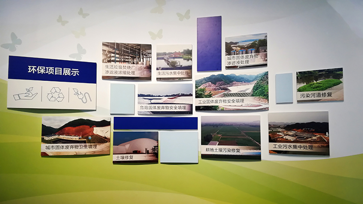 觀賞了實景模型,我們再看展示墻,上面還有許多滲濾液處理,污水處理,固廢處置等項目的現場實景照片,這些都是公司承接建設的項目,充分展示了公司在園區的關心支持下,通過科技創新,管理創新所取得的不凡成就。