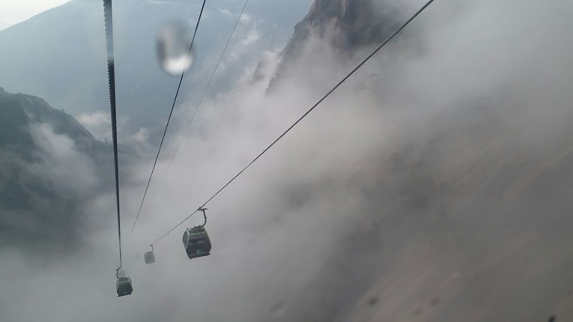 經過漫長的排隊等候我們終于坐上了上山的纜車。隨著纜車的慢慢高升,纜車外霧氣越來越深,穿過云層后看到黃山的真面目,黃山上特有的松樹正向我們伸出手來歡迎我們呢! 真是好美?。?/p>