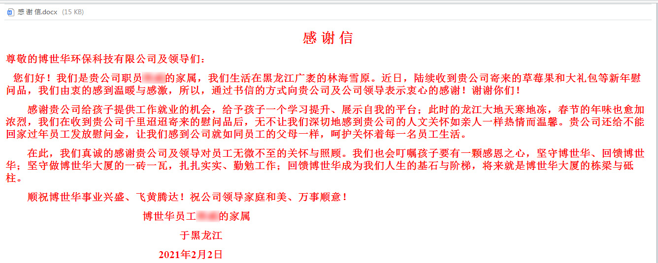 送“溫暖”:公司的發(fā)展壯大,離不開每一位員工家屬的鼎力支持和默默奉獻(xiàn)。公司加大對假期堅守崗位、不能回家與親人團(tuán)聚的員工的關(guān)愛,通過“春節(jié)大禮包寄親人”等活動,把博世華環(huán)保對員工的關(guān)心、關(guān)愛傳達(dá)給留杭、留項目員工家屬。近日,一個個寄托美好祝福的大禮包已陸續(xù)寄送至員工家屬手中,有家屬在收到大禮包后,激動地發(fā)來感謝信,感謝公司就如同員工的父母一樣,呵護(hù)關(guān)懷著每一名員工生活及成長,同時也表達(dá)出對員工主動留杭的支持及理解。
