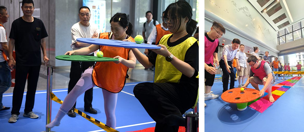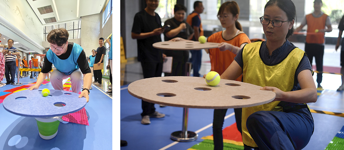 聽到裁判發出指令后,每隊第一名隊員開始運球比賽。游戲途中快速通過指壓板賽道、以及跨過障礙欄,同時需要保持平穩防止球掉落。通過賽道和障礙挑戰后,把球放入桶內。