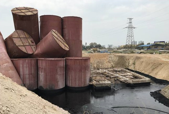 控制源頭。在事件現(xiàn)場設(shè)置了三道圍堰,確保儲罐區(qū)泄漏的硫酸控制在施工坑體內(nèi)。同時,確保2個大廢酸儲罐的絕對安全。事件發(fā)生時,2個大儲罐已有輕微傾斜。為防止小儲罐泄漏的硫酸浸泡腐蝕大儲罐,采取填土方式穩(wěn)固大儲罐,并實(shí)時監(jiān)測大儲罐是否下沉、傾斜、泄漏。