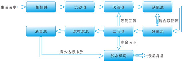 “格柵+沉砂池+改良型A2/O+二沉池+濾布濾池+紫外線消毒”工藝:進水中漂浮物及粗大顆粒物被格柵攔截,然后進入沉砂池,去除其中砂粒,防止其在后續(xù)構(gòu)筑物中沉積,出水進入整個污水處理部分的核心部分改良型A2/O系統(tǒng),污水從厭氧池進入生化處理系統(tǒng),依次流經(jīng)厭氧池、缺氧池、好氧池,同時混合液回流至缺氧池,出水排至二沉池,泥水分離,污泥回流至生化系統(tǒng),污水進入濾布濾池,過濾后出水進入紫外線消毒池,達標(biāo)后排放。